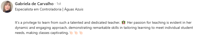 Atualmente, atuo como Especialista em Treinamentos Corporativos em Inglês e sou Mentora de Profissionais que desejam dar o próximo passo em suas carreiras através do Inglês.